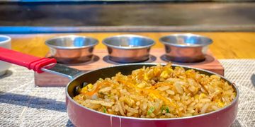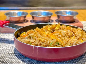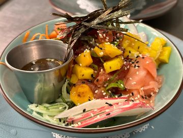 Serve on rice, topped with cucumber, avocado, edamame, seasonal fruit (mango), carrots, radish, with soy sauce choose between Tuna, Salmon, seafood or tofu, topped with seaweed.