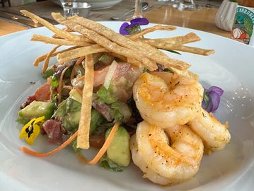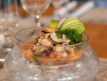 Seafood with passion fruit, cocktail sauce Acapulco Style, garlic olive oil, avocado, cilantro, onions hint of Mezcal