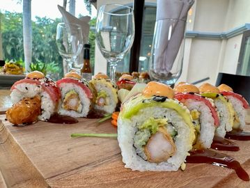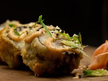 Tempura Mahi Mahi, cucumber, lettuce, avocado, asian style salsa, topped with Sriracha sauce.