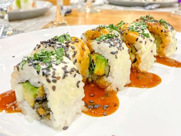 Tuna, Mahi–Mahi, cream cheese, crunchy tempura, garlic aioli, chipotle mayonaise, avocado, cucumber, sesame seeds