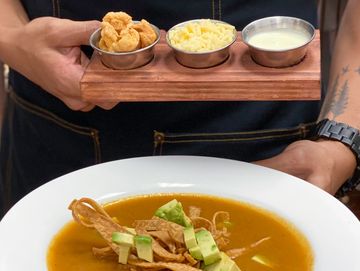 Served with crunchy tortilla, cheese, sour cream and avocado.