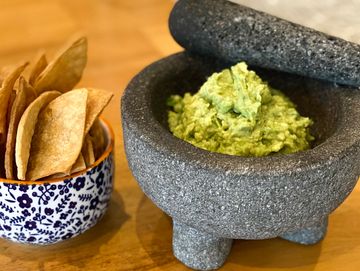 Made tableside, served with warm corn tortilla chips on a specially cured stone