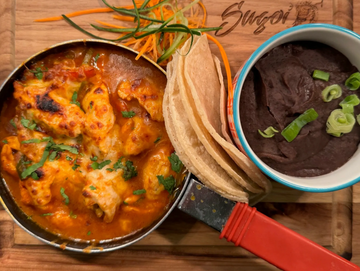 Sautee chicken, bell pepper, onions, cheese, refried beans and corn tortillas with chile morita sauce