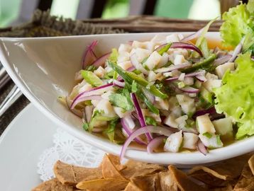 Traditional ceviche with lemon, coriander, onion, tomato and red bell pepper, served with tortilla chips